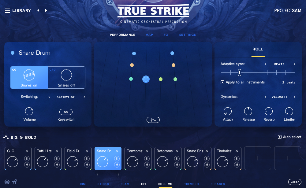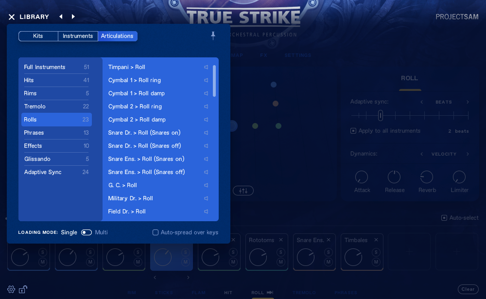 - 51 orchestral percussion instruments ranging from timpani and toms to triangle and temple blocks